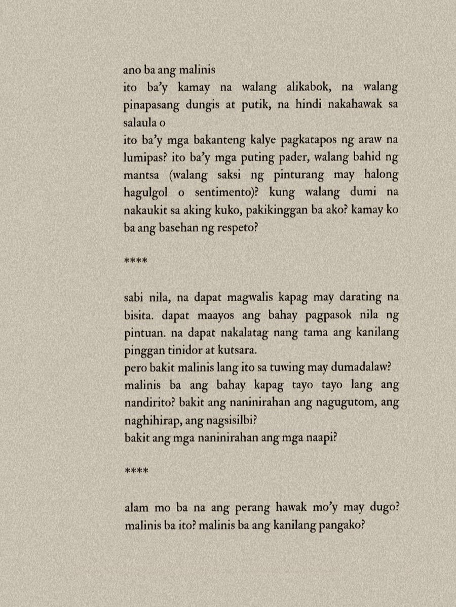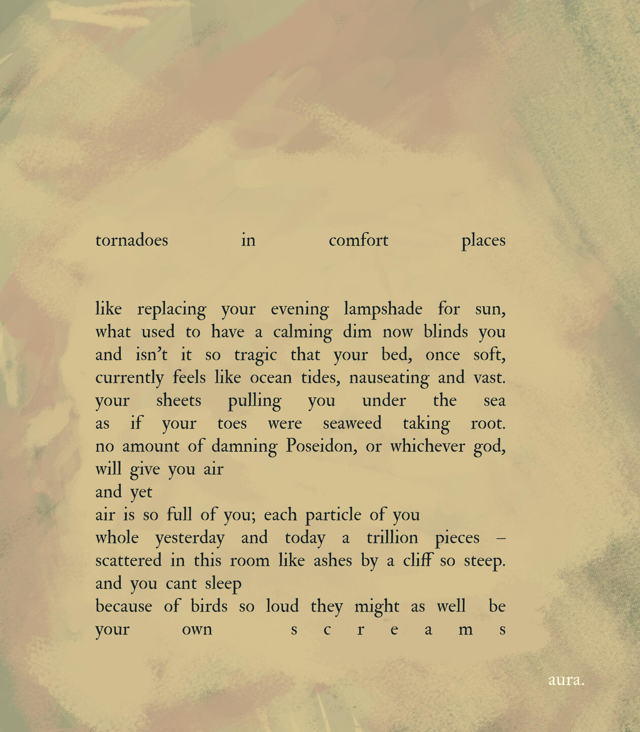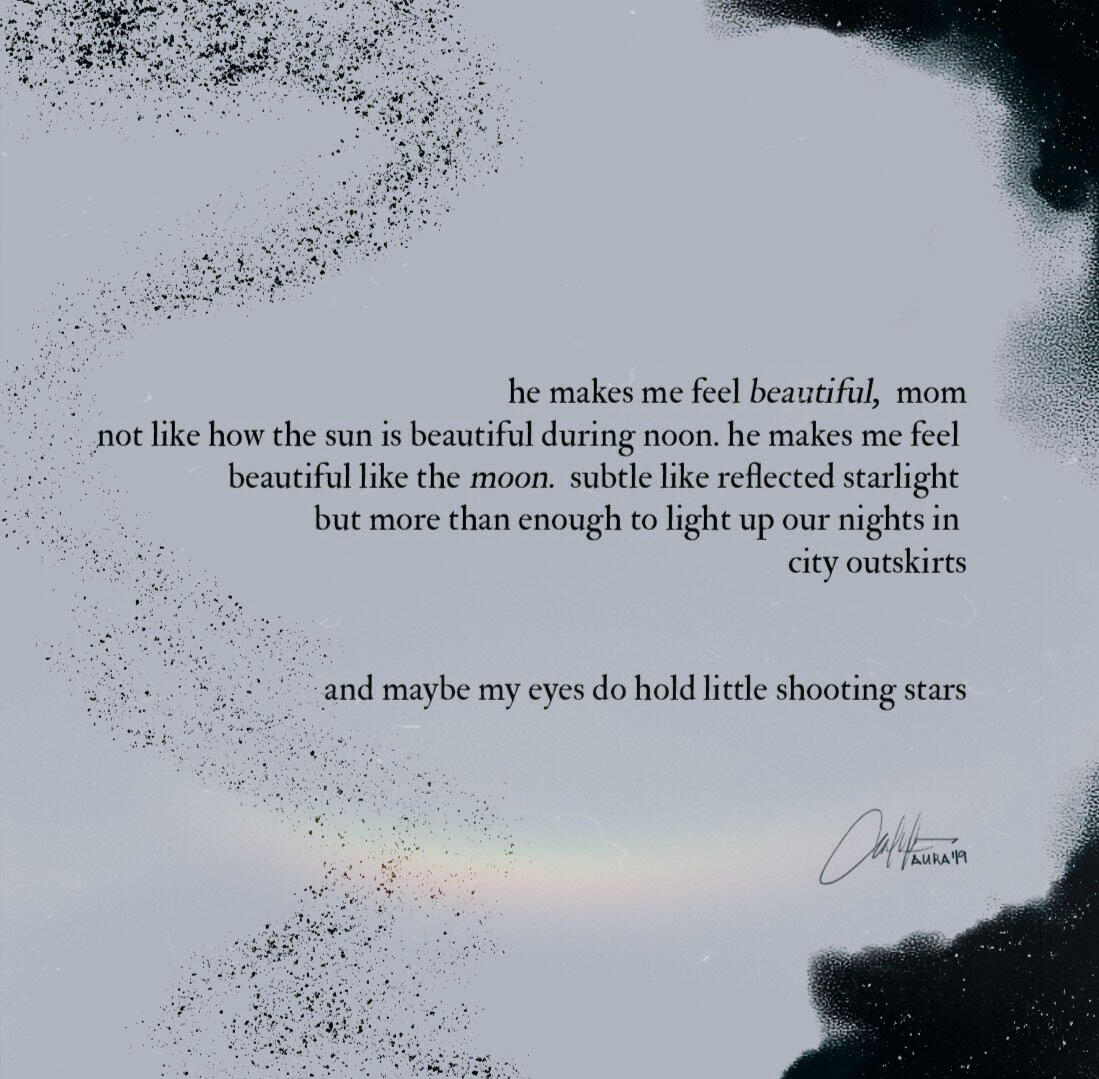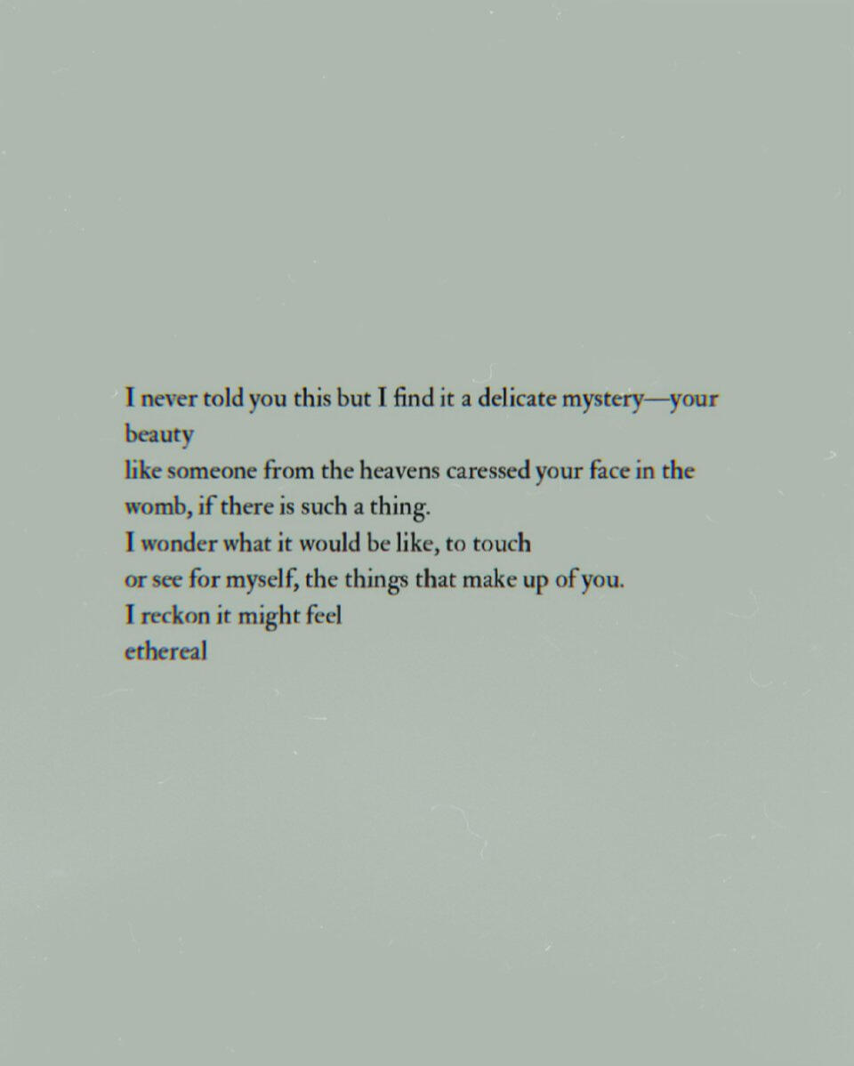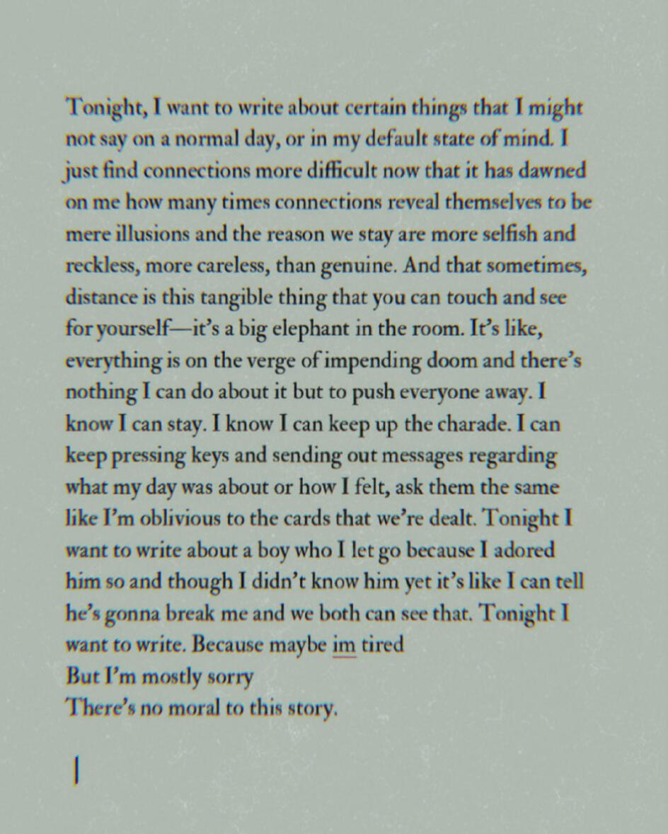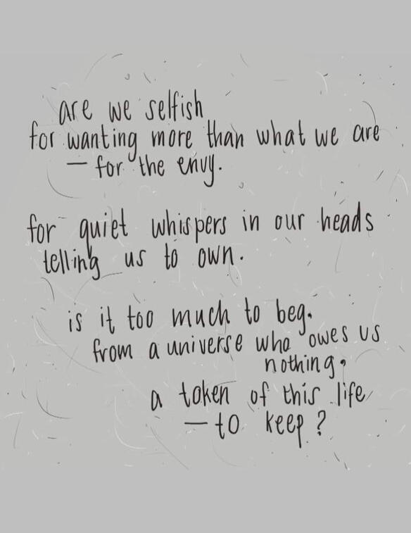 UNTITLED IIYou have an abundance of poets and I wonder if you carry the weight of all their words in your pocket like spare change. I wonder if they pull you down like gravity—like promises. Do you walk heavier in the mornings or are you too familiar with the intricacies and consequences of being heartbreak personified that you walk without a hitch in your step?You have your collection of woes and I wonder, when you shower do you feel like you're being drenched by the sadness of all the girls who cried for you like holy water to the exorcised? do you have trouble sleeping at night or are you comforted by the pitter patter of the water droplets by your windowsill?You carry a your string of strange sentiments and mementos but I wonder, do you ponder about how many chests you've left hollow, how many wholes you've left in fractions, or how many scars you've pierced permanent? Do you already keep a tally and am I but another strike?But I don't want to know how many hearts you've broken in this lifetime. I don't want to find out exactly how much of the same thing you fell in love with. Don’t tell me how much of yourself you've already given someone else—worse, how much of another person you've given me too. I don't want to know how many versions of myself you already knew.