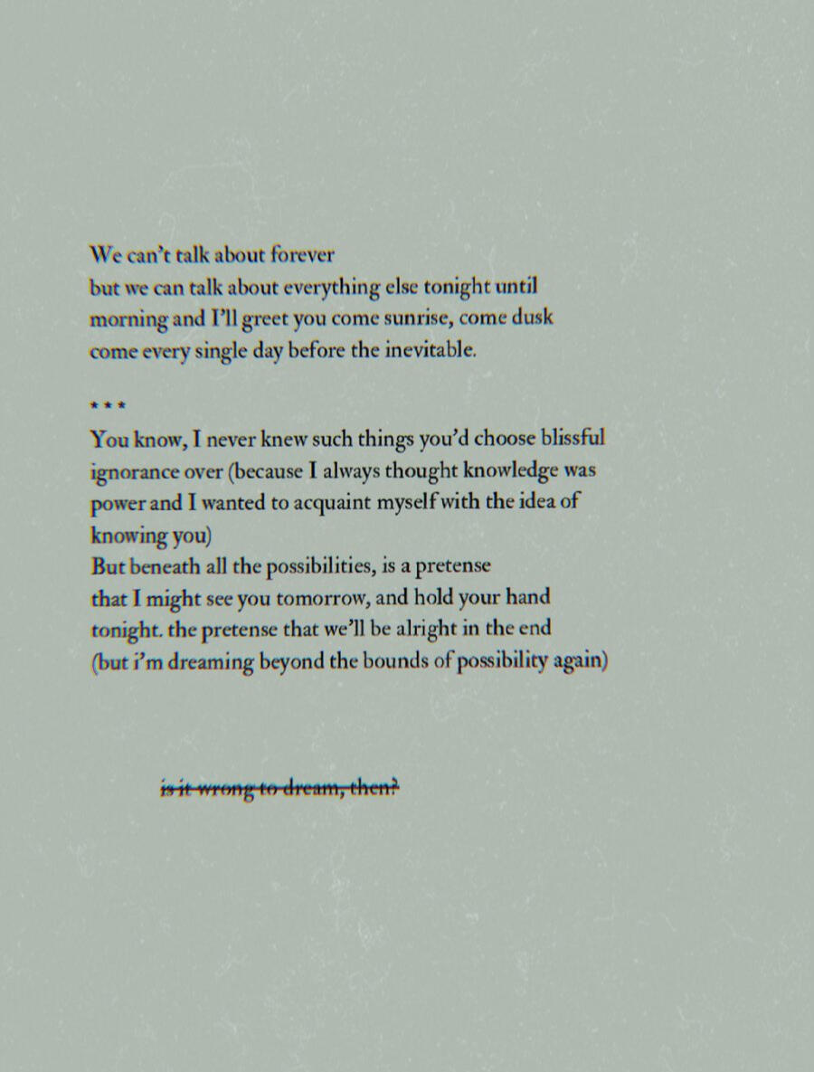 UNTITLEDWhen I was younger, I wondered if chaos was the sea (and every single individual who ever wanted to feel alive wandered to see it for themselves at least once or twice). Now that I'm older i realized that maybe Chaos is the long road before reaching the morning sun—littered with signs and billboards pointing east (towards the sleeping horizon)'To better days!" says a giant neon signHow a single event could be both intentional and accidental, I couldn't begin to explain to you but that's what it was when we got ourselves lost in Chaos.In Chaos, your knuckles turned white and my fingers grew stiff from the frost but you held my held my hand anyway. In Chaos, your trembling lips kissed my tears. You plucked the small flowers that peeked through the cracks in the sidewalk and lay them at my feet as I dozed in a fitful sleep. I captured elusive rainbows after the sky stops crying just to show you colors that come after anguish. I walked you down the path where wilting plants led the way and showed you how to water them so that they may live again. Chaos is the long road by the sea (it's a long journey). We stole a car halfway and named her, Hopefully. As we navigated through chaos, we passed more red lights than we could count and I remember our laughter reverberating through the night as we screamed "Fuck you universe!"I'd like to think that we drove on long after the asphalt turned to dirt roads and the stop signs became picket fences. We have yet to answer the question 'what comes after chaos? ' because darling, we're still traveling. right now, as I listen to your troubled sleeping i just want you to know that i'd only dare being lost in chaos if it meant getting unlost with you. and if you ask me why, it's simply because I love you